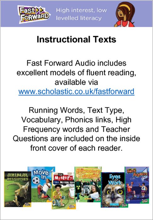 Fast Forward Instructional Texts are especially designed for teacher-led guided or shared reading sessions with less-able readers (either individuals or groups at the same level) and form the core of Fast Forward’s finely-levelled approach. Vibrant illustrations and photographs are paired with engaging, varied topics and stories to ensure that there’s something for every type of reader. Audio to accompany each Instructional Text can be downloaded from www.scholastic.co.uk/fastforwardaudio.