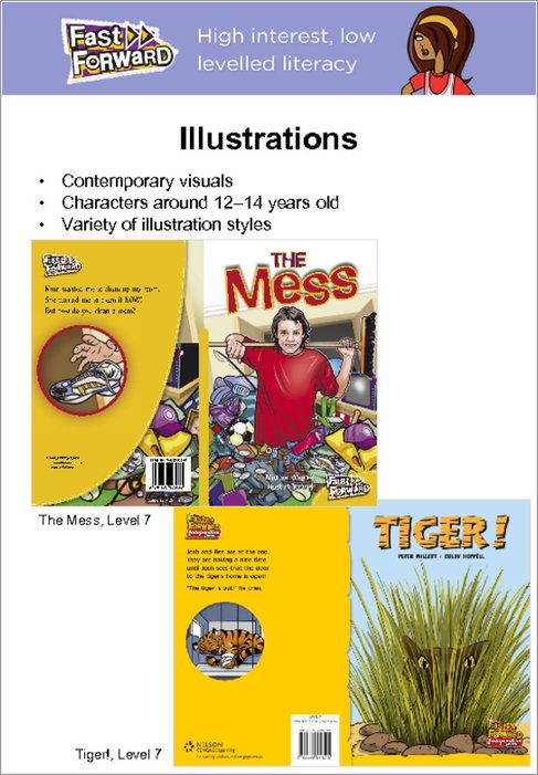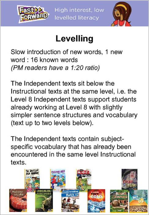 Fast Forward books are for struggling readers, but with an interest level of 9-14 years. To ensure that children are given every opportunity to succeed in their reading, the introduction of new words is one new word for every 16 known words (1:16). Unlike levelled reading programmes for younger children, Fast Forward introduces more complex sentences at the earliest levels.