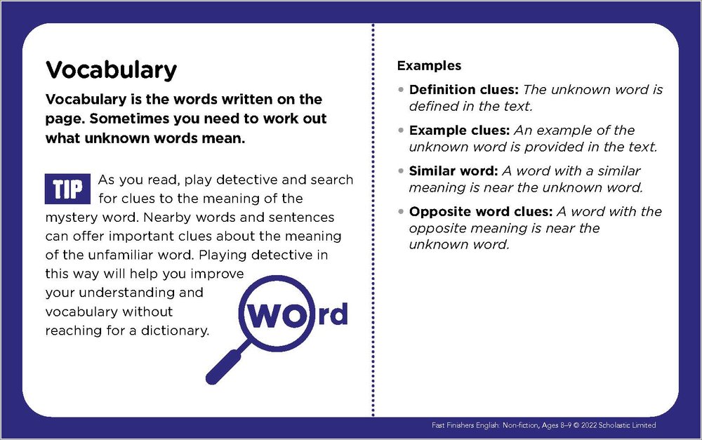 - Comprehension-helper cards that provide kid-friendly definitions, tips, and examples to help students master reading skills