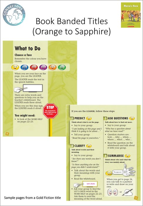 Children work in small independent groups of up to six, each taking turns to be the leader as they read and discuss a book together. Clear prompts show the leader how to focus the discussion and engage their team members to predict outcomes, clarify issues, ask questions and evaluate content.