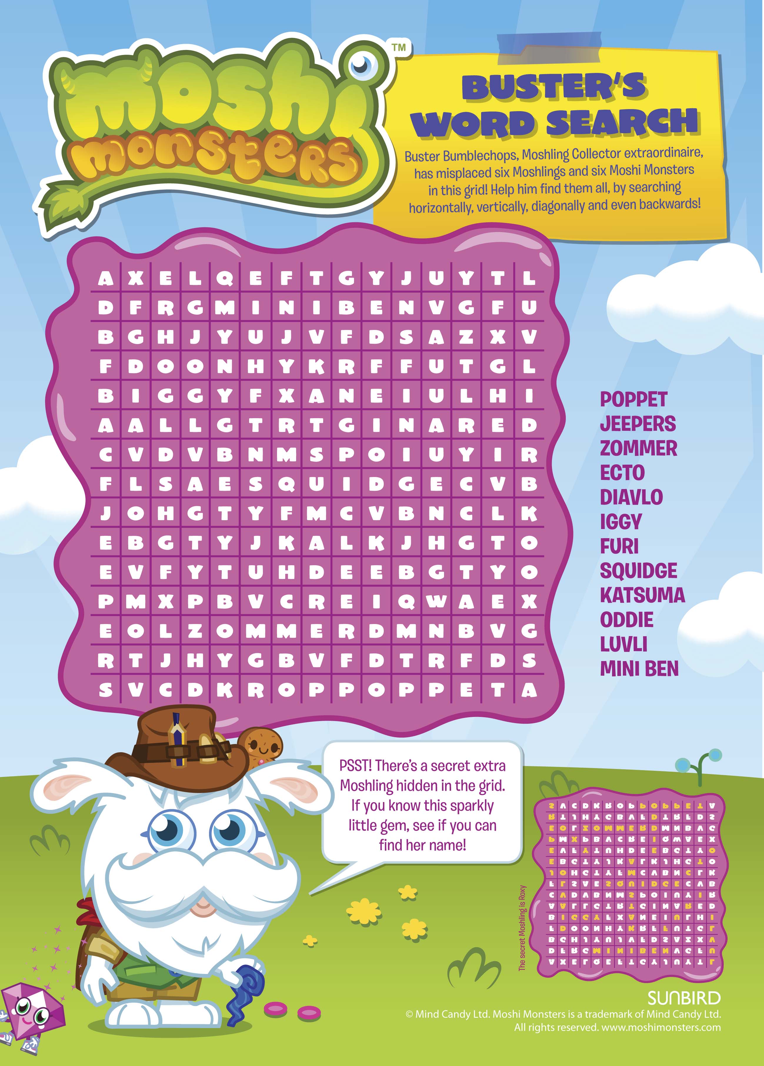 Help Buster Bumblechops find six Moshlings and six Moshi Monsters in the grid.