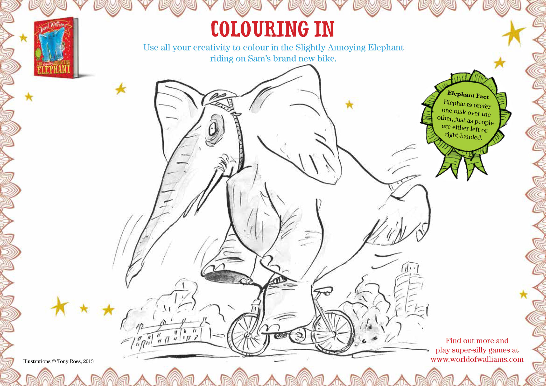 Get creative and colour the Slightly Annoying Elephant riding Sam’s brand new bike!